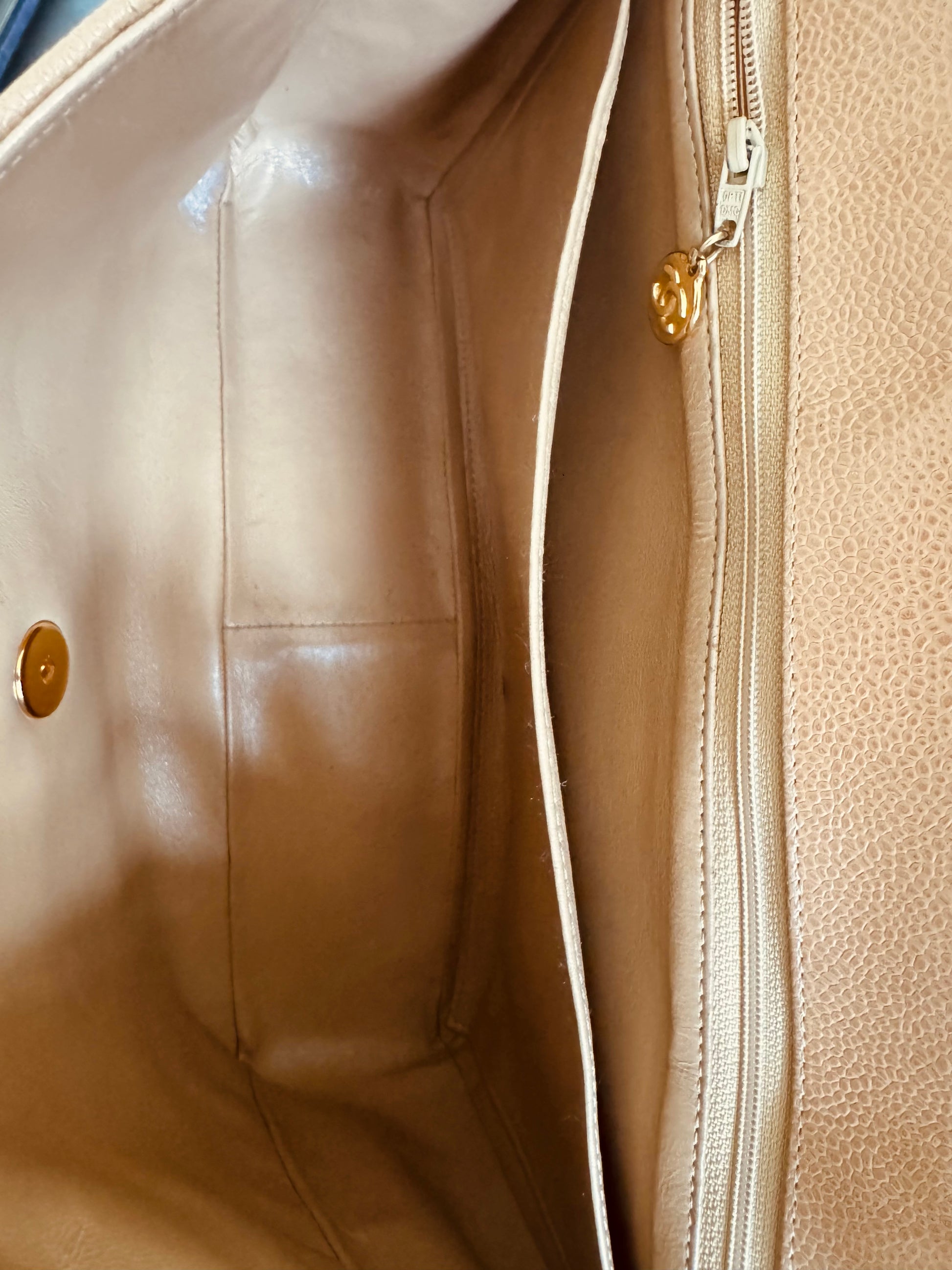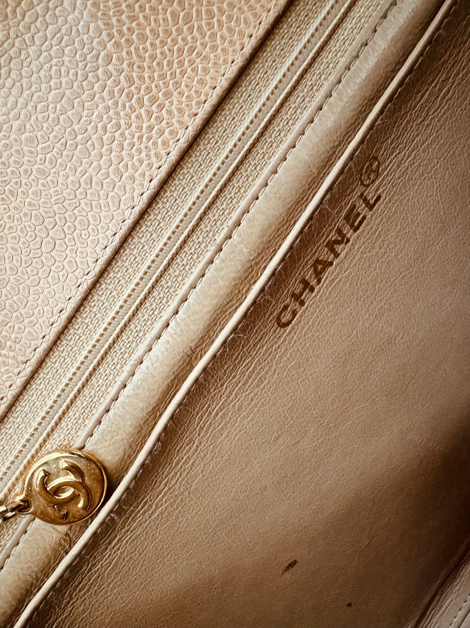 ∙ Interior: Beige lambskin, one zip pocket with CC charm, one slip pocket